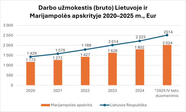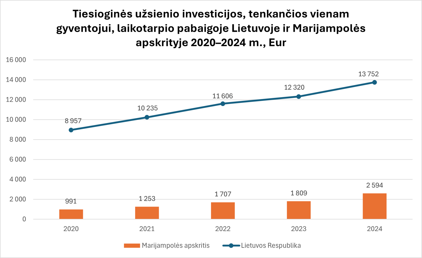 Tiesioginės užsienio investicijos, tenkančios vienam gyventojui, Marijampolės apskrityje 2020–2024 m. laikotarpiu išaugo daugiau nei 2,5 karto – nuo 991 Eur iki 2 594 Eur.